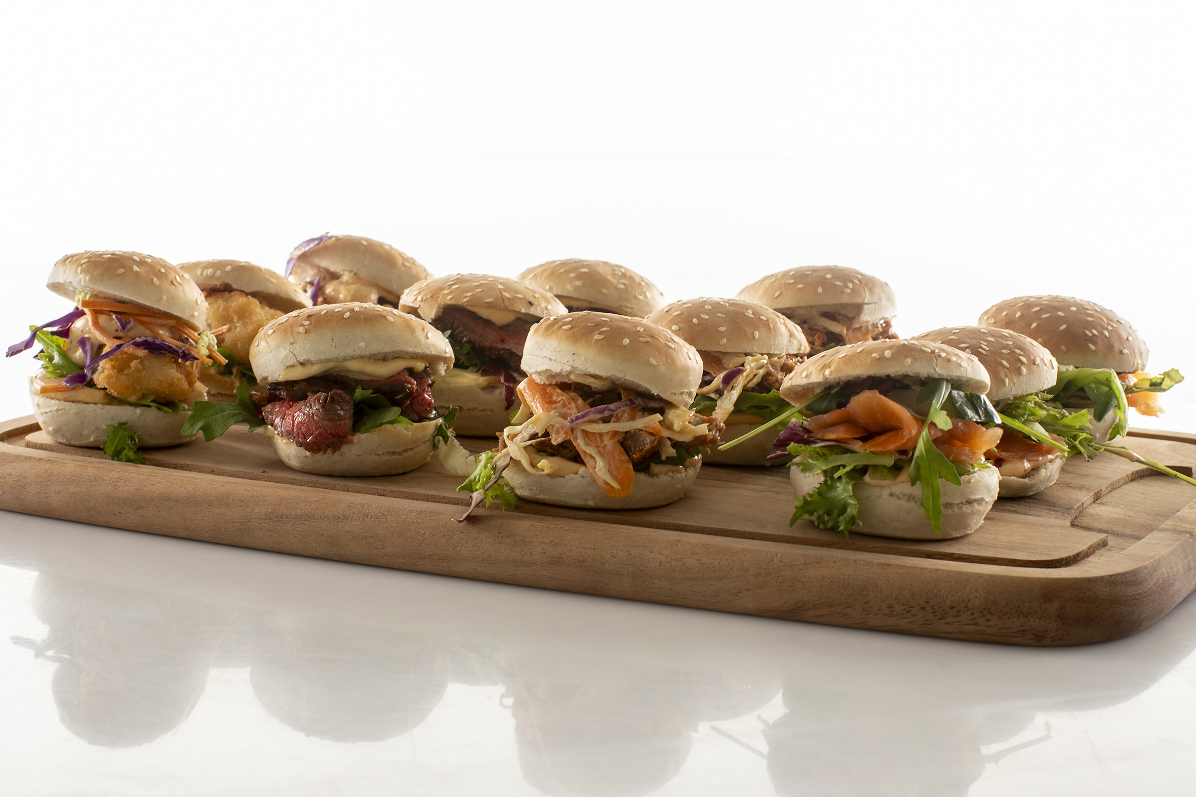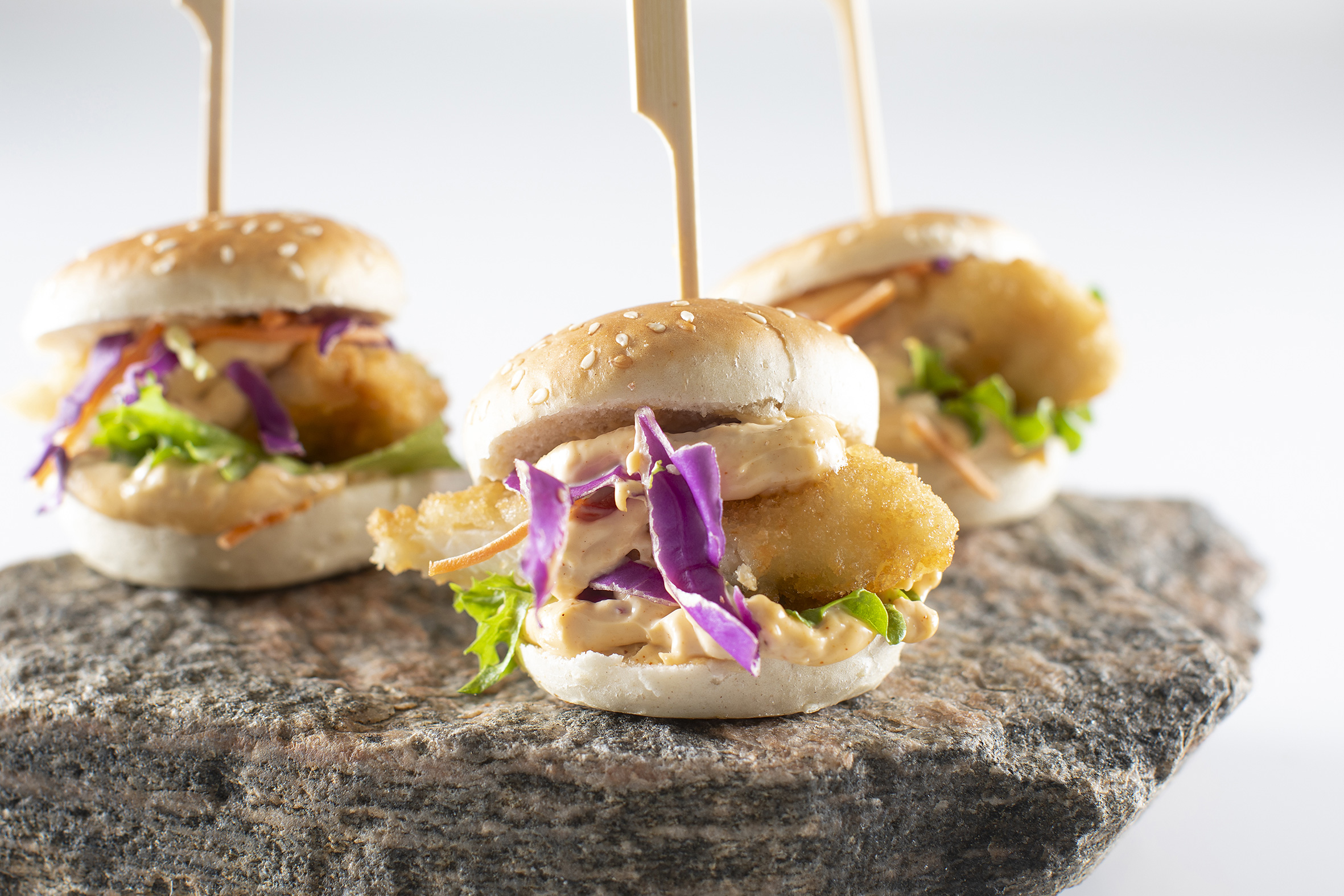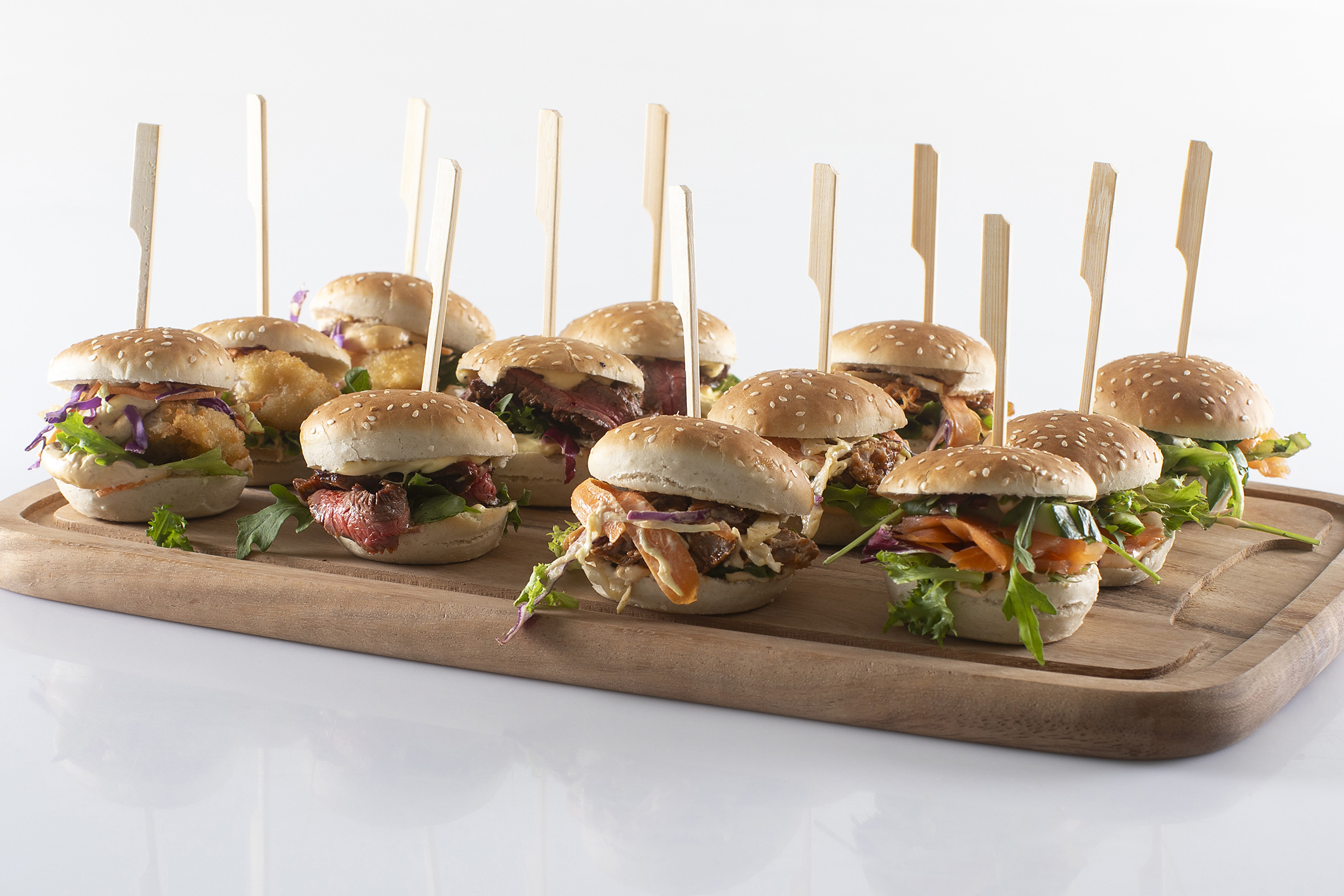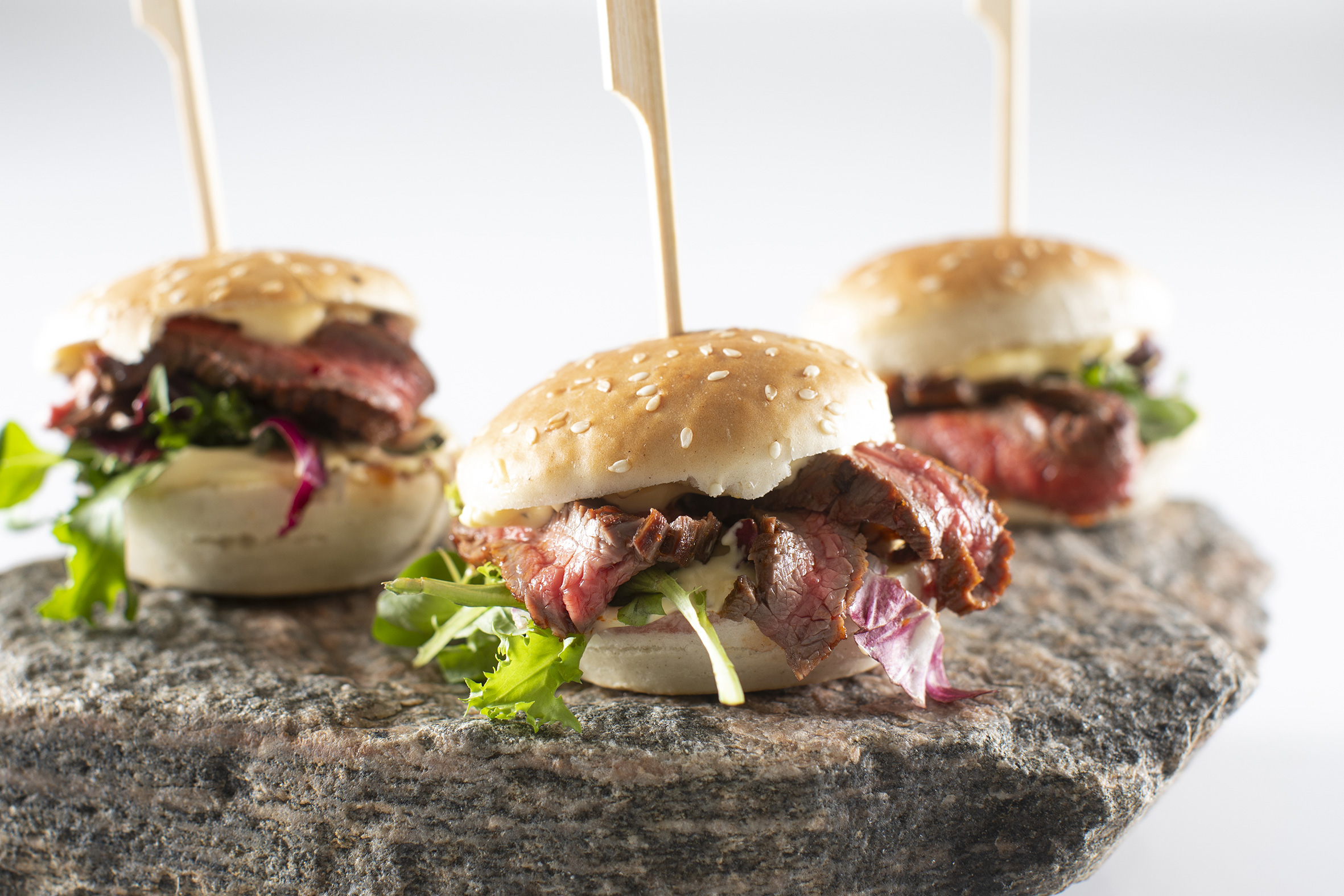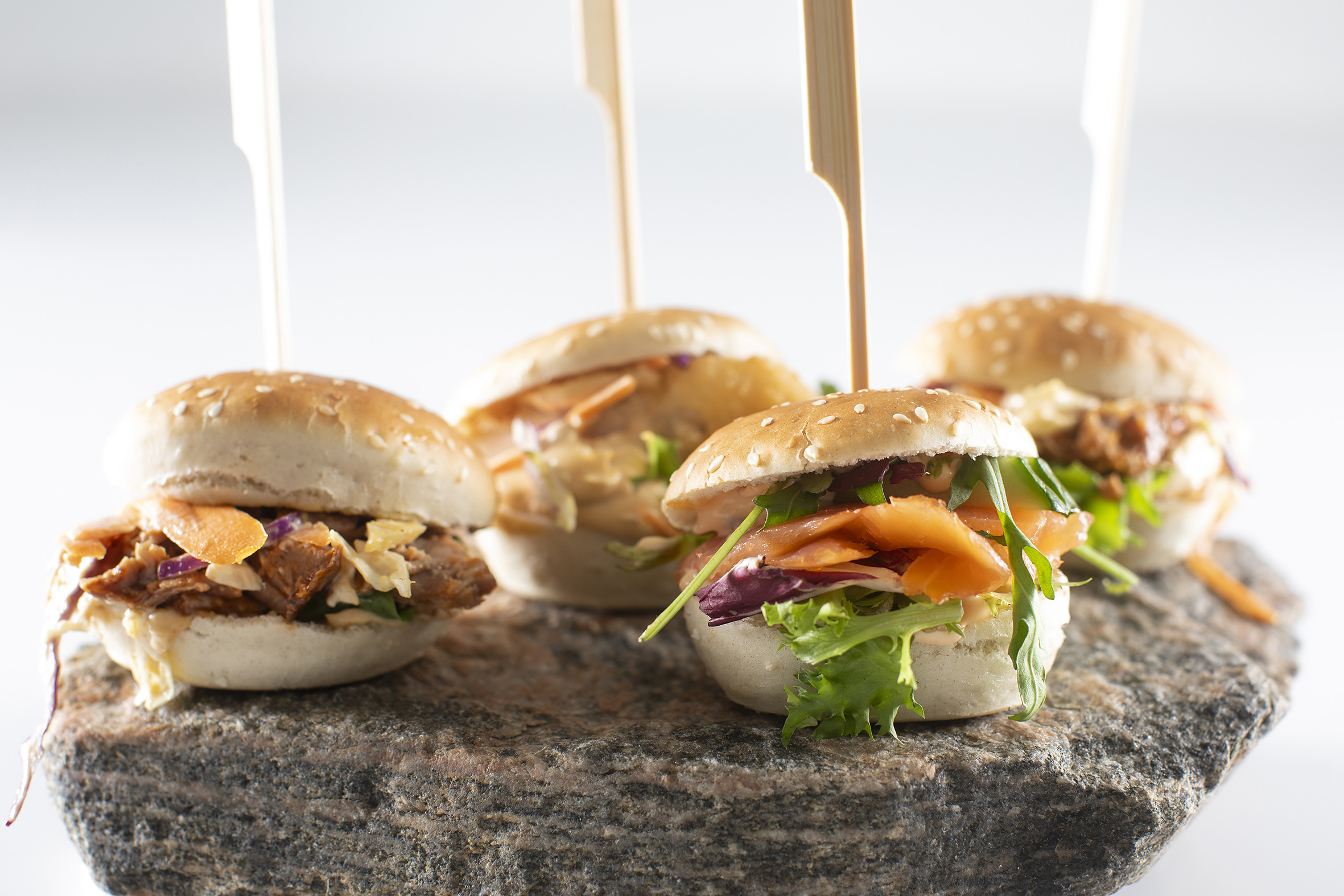 De små, lækre sliders er perfekte som et let måltid – og så kan de nydes stående.