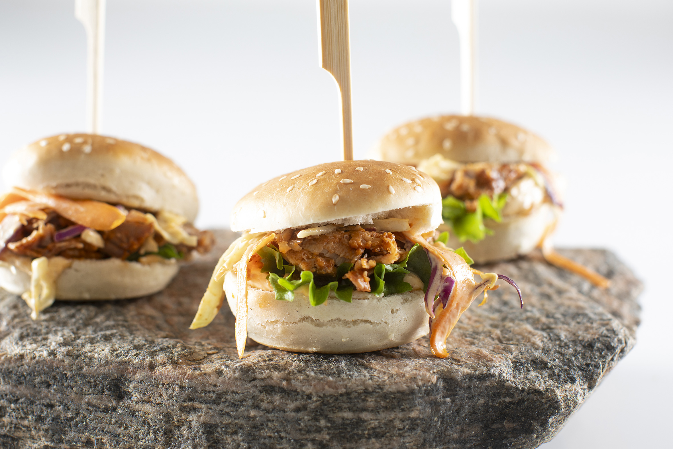 Den velkendte med crispy chicken og chilimayo, hvor det saftige stykke kylling har fået en sprød overflade og sammen med chilimayo udgør det et perfekt makkerpar. - Sliders med pulled pork og BBQ-dressing